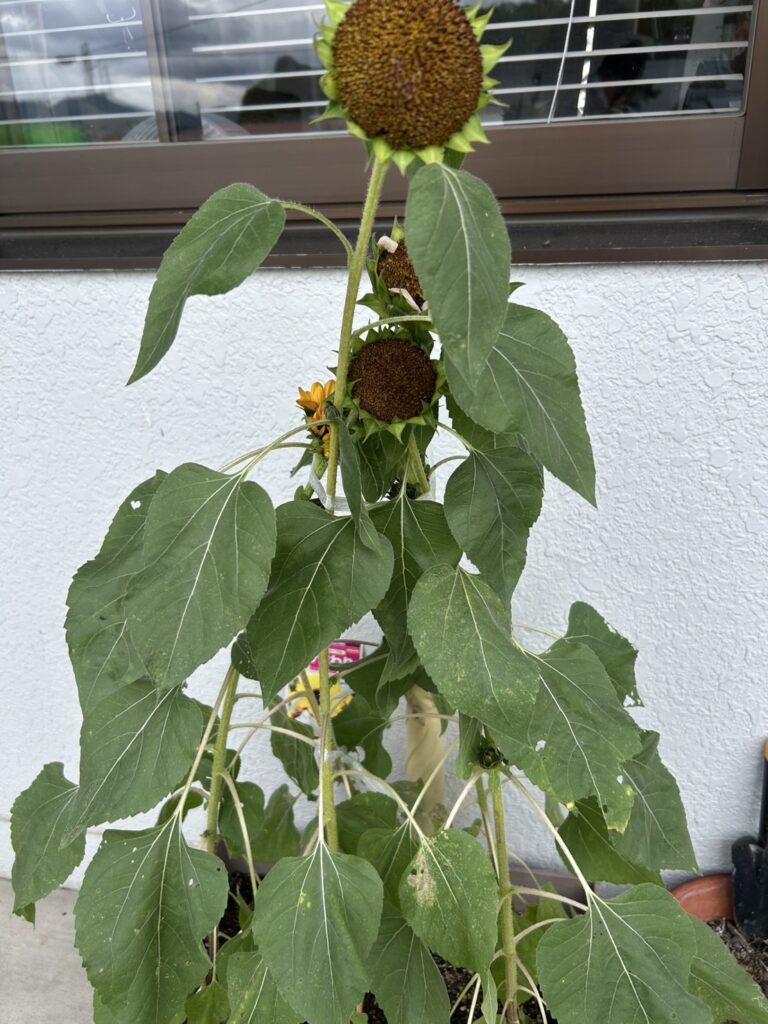 医院裏口でスタッフが種から育てたひまわりからまた種が取れそうです🌱